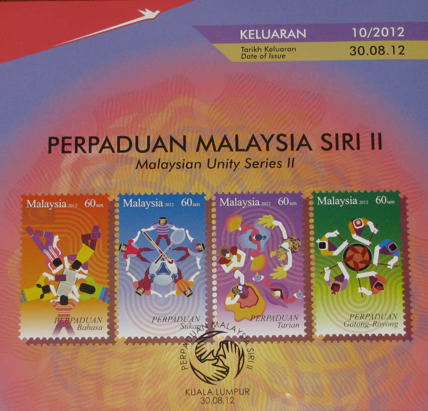 Next week we will be celebrating the 55th Independence Day (Merdeka Day)! A stamp issue is planned on 30 August 2012 with the title Malaysian Unity Series 2. There are 4 separate stamps (not setenant) of 60 sen in this issue. As usual a folder is also issued.