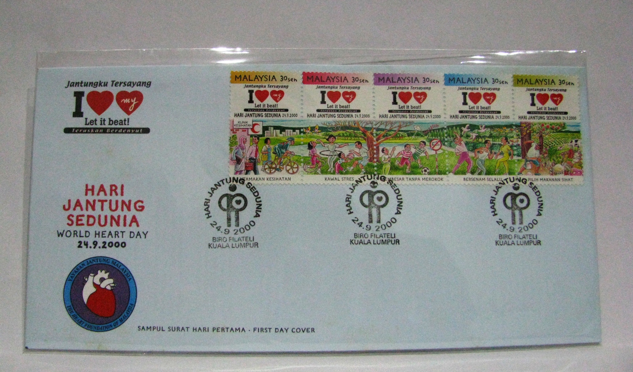 I am a fan of setenant stamps and as such I will buy quite a lot of FDCs and stamps for a setenant issue for my own collection. I went through all my FDCs for the World Heart Day issue and found ONE composite variation FDC! It has the “no dot”, “partial dot” and “dot” between the month and year! Have a look: