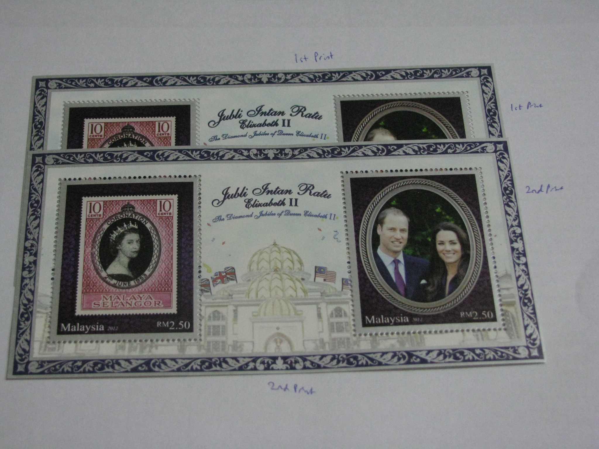 (3) I am compiling a set of 2 error sheetlets, 2 TRH sheetlets, the TRH sticker on folder, KL & KLCC cancellation FDC set (stamp FDC & MS FDC), KL cancellation FDC set (stamp FDC & MS FDC) with 2nd print MS on FDC, 1st print and 2nd print miniature sheets (read below) and the poster (which contains the original retracted design images) for sale. If you are keen, drop me a note. I have only one set on offer. It will be expensive because I obtained the sheetlets from the open market and not from the post office and the 2nd print miniature sheets are scarce. This way you can get everything in one go. Check it out at eBay (search for Royal Visit) after my links expire.