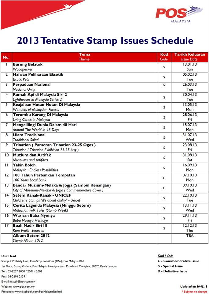 Here is the latest stamp programme from Pos Malaysia. Do note the various changes in dates and topic of issue. October looks like a very busy month!