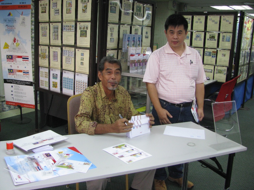 The designer popped in around 10:00 am much to my surprise. No body knew he was there. He hung around for a short time. There was no sign and I could only recognized Hazel Design and a few persons getting his autograph. Here is En. Abdul Rahim. He designed the miniature sheet. By the way, the person standing next to him is not me 🙂