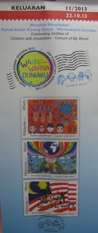 There will be a special postmark “”Celebrating the abilities of children with disabilities” on the normal mails sent through the postal system. So what are you waiting for, drop some mails. By the way there is a planned exhibition on Level 6 in Pavilion Mall. Check out the information at (scroll to the bottom): http://www.unicef.org/malaysia/media_news13_three_talented_child_artist_receive_stamp_of_approval.html#.UmS2XBOwrwc