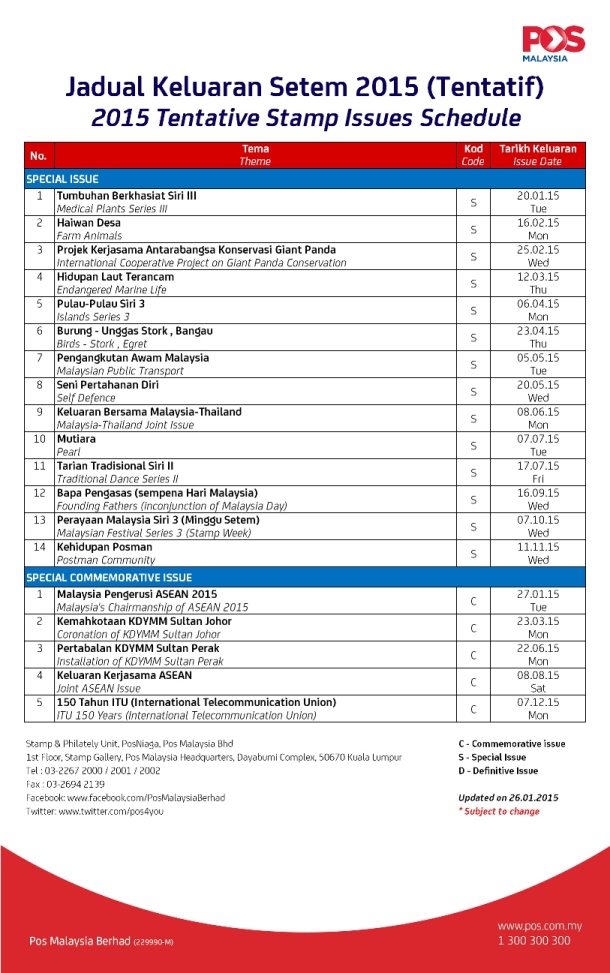 January revision to the 2015 Malaysia Stamp Issue Schedule