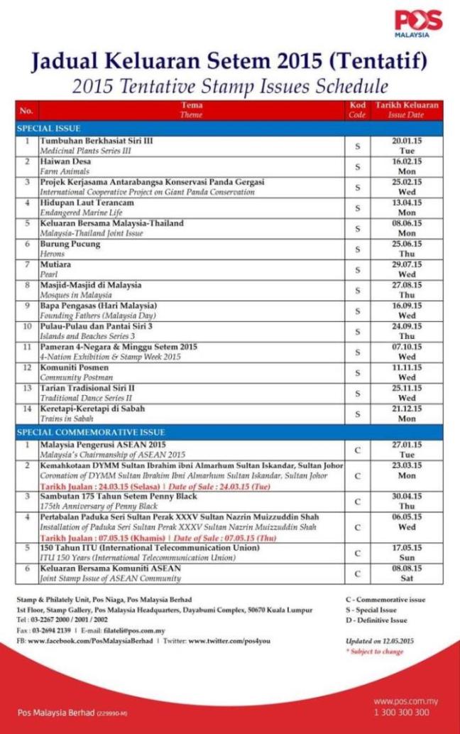 Here is the May 2015 revision to the Malaysia Stamp Issue Schedule. Note the Four Nations Stamp Exhibition in October 2015!