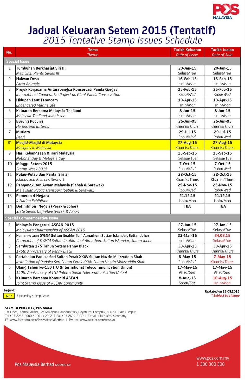 Here is the latest stamp issue schedule. The next issue which is the Malaysia Day issue has moved forward to 15 September 2015. This is a good move!