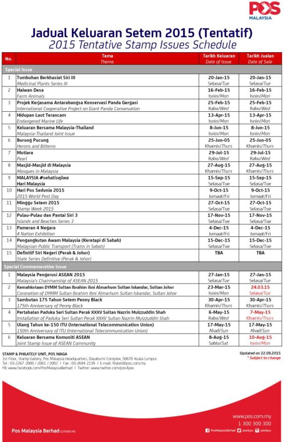 The World Post Day is schedule to release a single 60 sen stamp FDC with a launch in the National Mail Centre in Shah Alam. Meanwhile the Stamp Week might see the release of a much awaited issue which was previous slated to be released… more updates when the news is confirmed.
