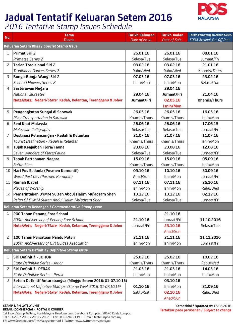 Here is the 15 June 2016 updates to the stamp schedule. Amend your diaries where required…..