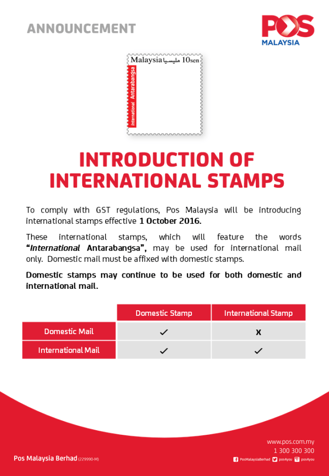 However, a separate class of stamps called International (Antarabangsa) stamps will be on sale without GST.