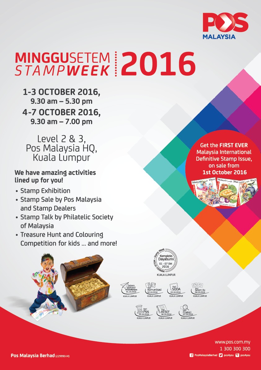 The Stamp Week will be held in the General Post Office, Dayabumi Complex in Kuala Lumpur. The event will be held on Level 2 and Level 3 from 01 – 07 October 2016. There will be daily cancellations during the week.