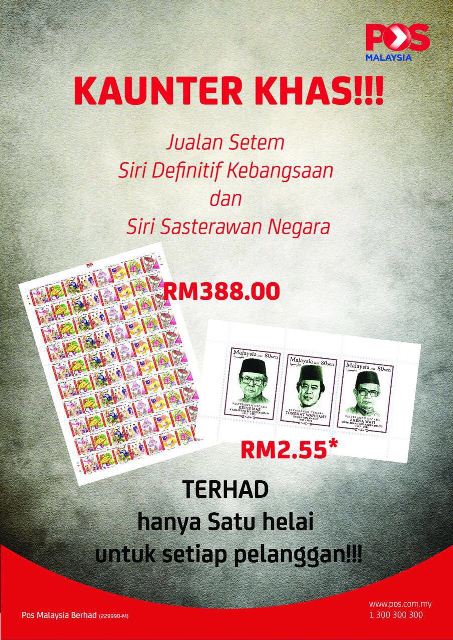 The sale is expected tomorrow at Counter 4 in the Philatelic Bureau Headquarters in Kuala Lumpur. It is limited to one full sheet per customer.
