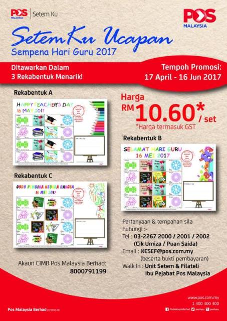 Today (17 April 2017), Pos Malaysia issued 3 special Setemku (personalised stamp) sheetlets to celebrate the upcoming Teacher’s Day on 16 May 2017. Here is the promotional poster along with the ordering details.