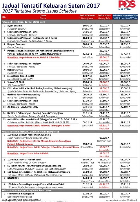 29 August 2017: Updated Malaysia Stamp Issue Schedule
