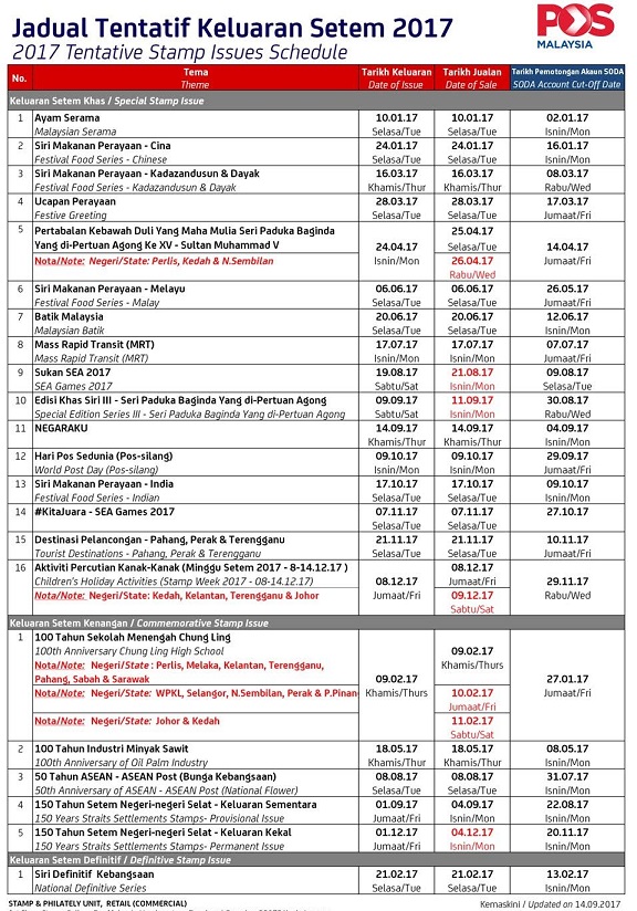 Here is the latest. The NEGARAKU was reclassified from Commemorative Stamp Issue to Special Stamp Issue. The World Post Day issue has been renamed as Pos-Silang.
