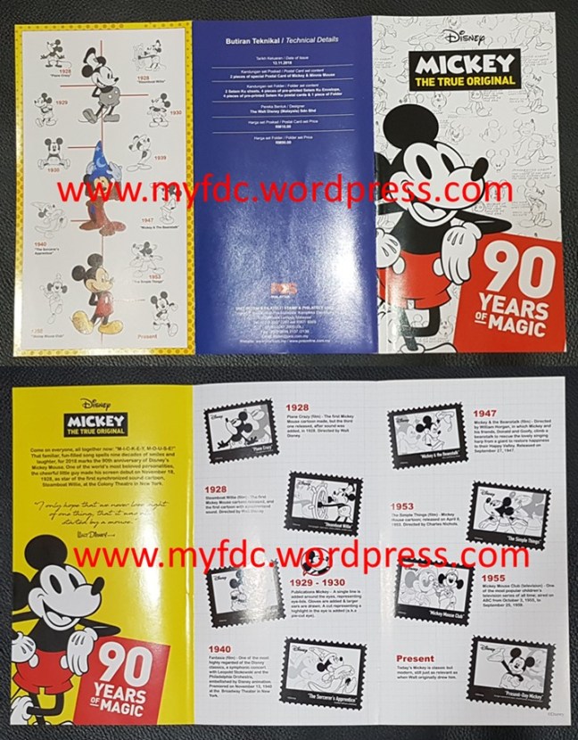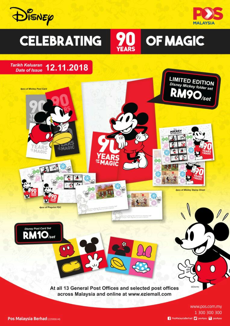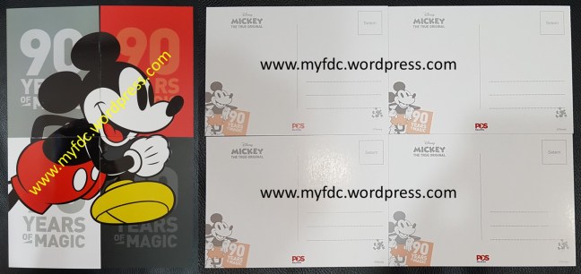 Pos Malaysia is issuing a special Mickey Mouse Folder Set in conjunction with the 90th Birthday of Mickey. This will be issued on 12 November 2018 on the first day of the Stamp Week 2018. There is also a Disney postcard set.