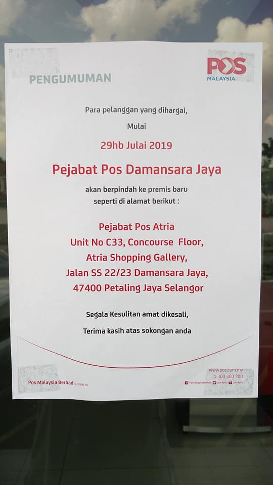 The last day of operation of the Damansara Jaya Post office is on 26 July 2019. The first day of operation for the Atria Post Office is on 29 July 2019.