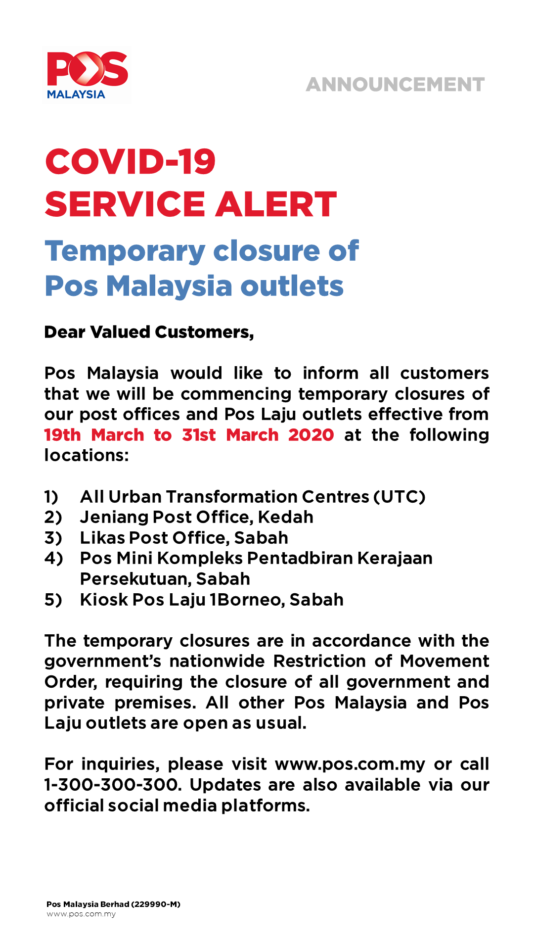 Malaysia announced the implementation of nationwide Movement Control Order (Perintah Kawalan Pergerakan) on 16 March 2020. It takes place tomorrow on 18 March 2020 until 31 March 2020. However the postal service will continue as an essential service.