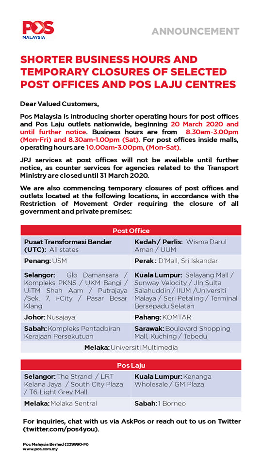 20 March 2020: Pos Malaysia reduces the Service Hours