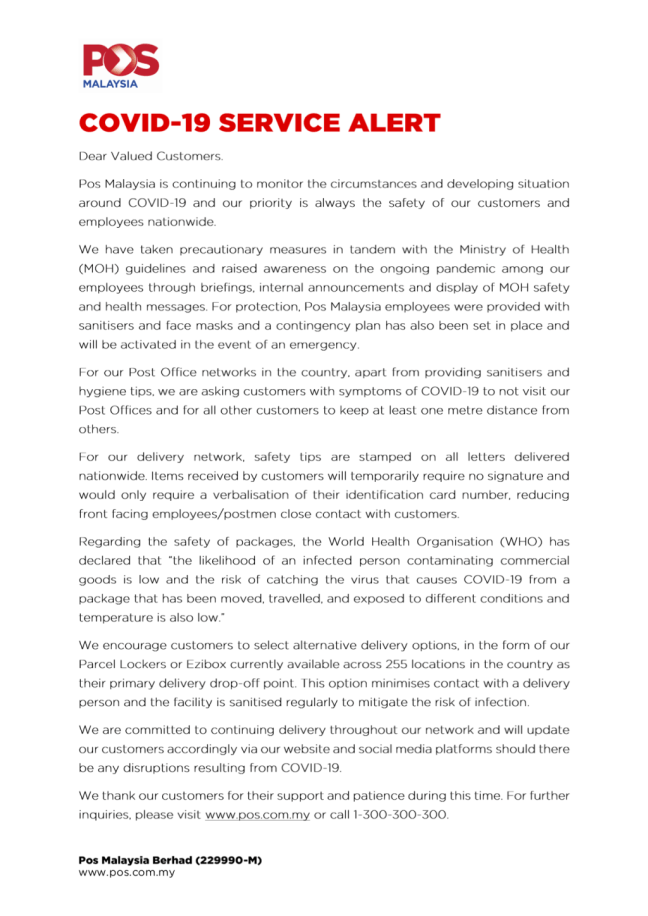 Pos Malaysia announced on 17 March 2020 via a COVID-19 Service Alert that safety tips will be stamped on all letters.