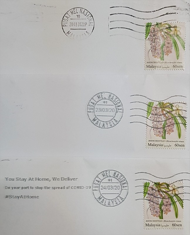 Mails were sent out daily from a nearby post box. Finally, the mail processed from the National Mail Centre (Pusat Mel Nasional) Machine 01 (double ring) dated 24 March 2020 was found with the COVID-19 safety slogan: