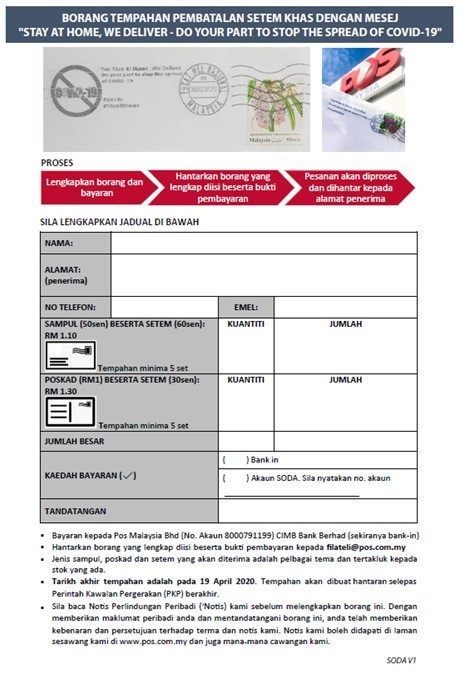 Click this link for the form: BORANG TEMPAHAN PEMBATALAN SETEM KHAS DENGAN MESEJ STAY AT HOME, WE DELIVER – DO YOUR PART TO STOP THE SPREAD OF COVID-19_SODA_v1.