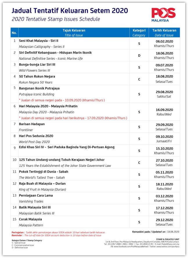 The strange thing about philatelic news is that they tend to agglomerate and come out at the same time thus not giving us much time to digest. So, we have here an updated Malaysia Stamp Issue Schedule Programme. Time to update out diary again. You know the drill!