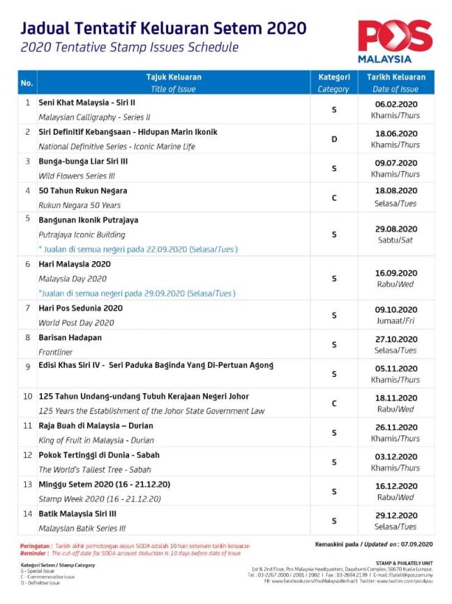 The “Vanishing Trades” and “Malaysia Pattern” issues have been dropped from the list. However the Stamp Week 2020 makes an appearance from 16 – 21 November 2020!