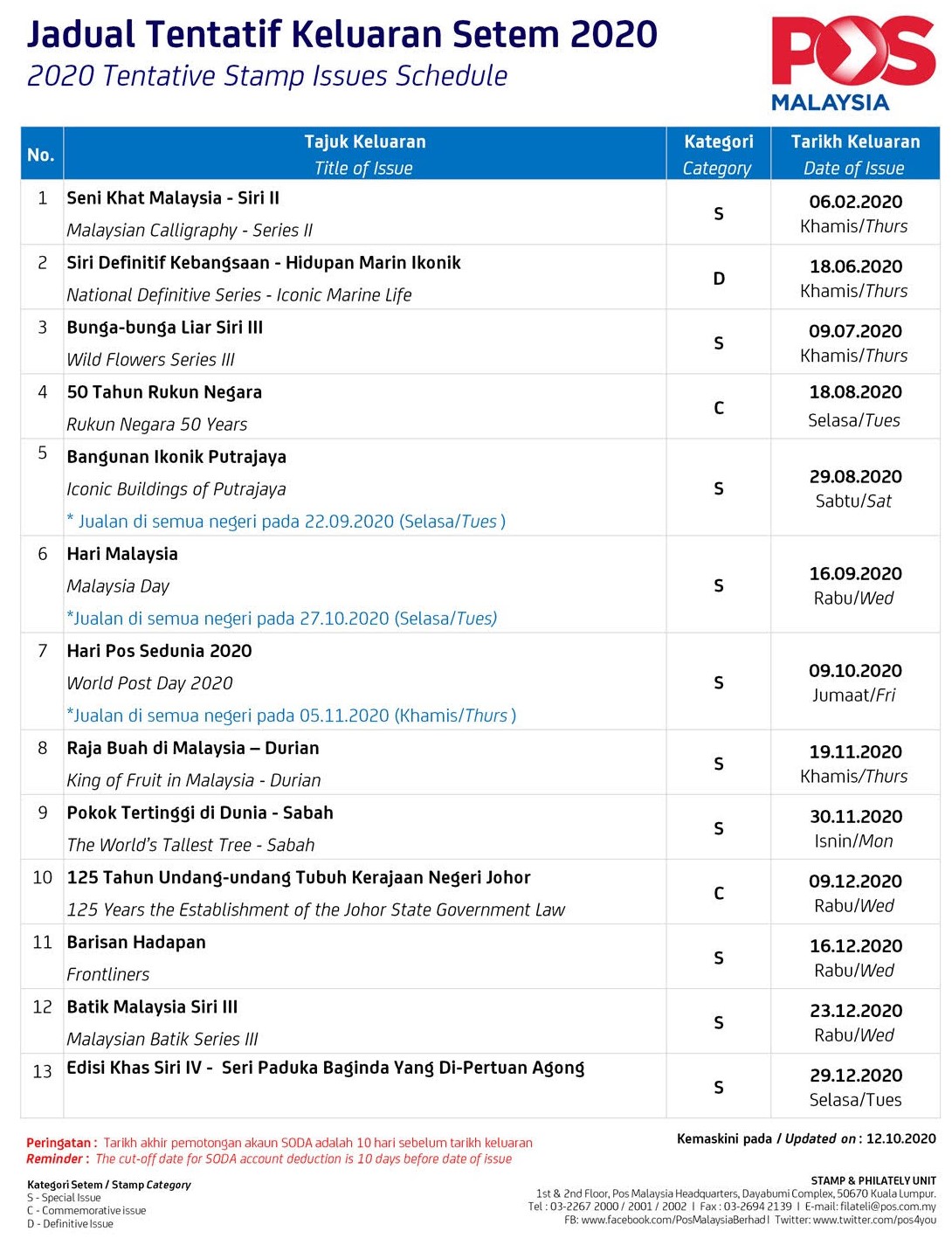 12 October 2020: Latest Updated 2020 Malaysia Stamp Schedule Programme
