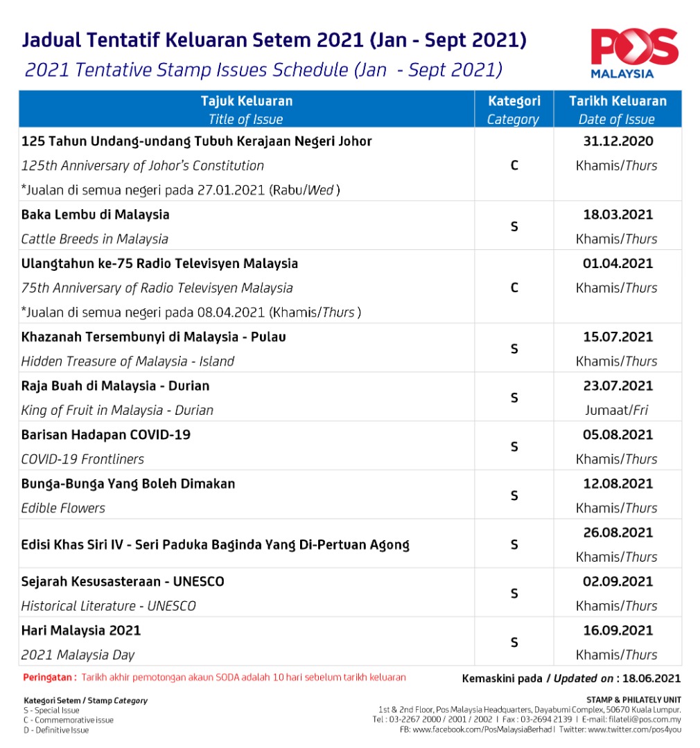 18 June 2021: Updated Latest 2021 Malaysia Stamp Issue Schedule Programme