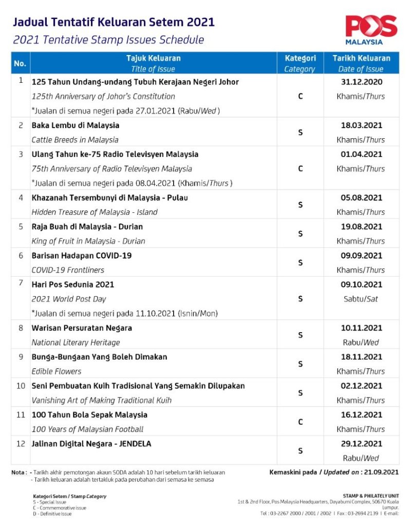 2 thoughts on “21 September 2021: Latest Tentative Malaysia Stamp Issue Schedule Programme”