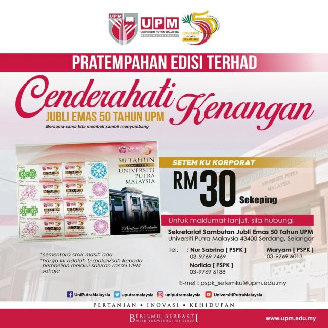 The 50 Years Anniversary of Unversiti Putra Malaysia Personalised Stamp (Setem Ku) mint sheets are now available for sale.