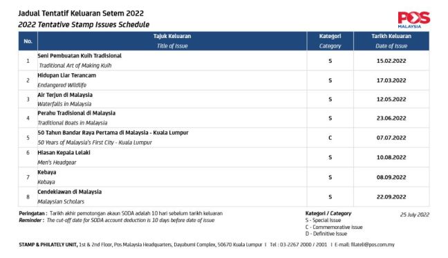 The issue will comprise of 2 x 70 sen and 2 x 80 sen with an additional miniature sheet of RM 5.00.