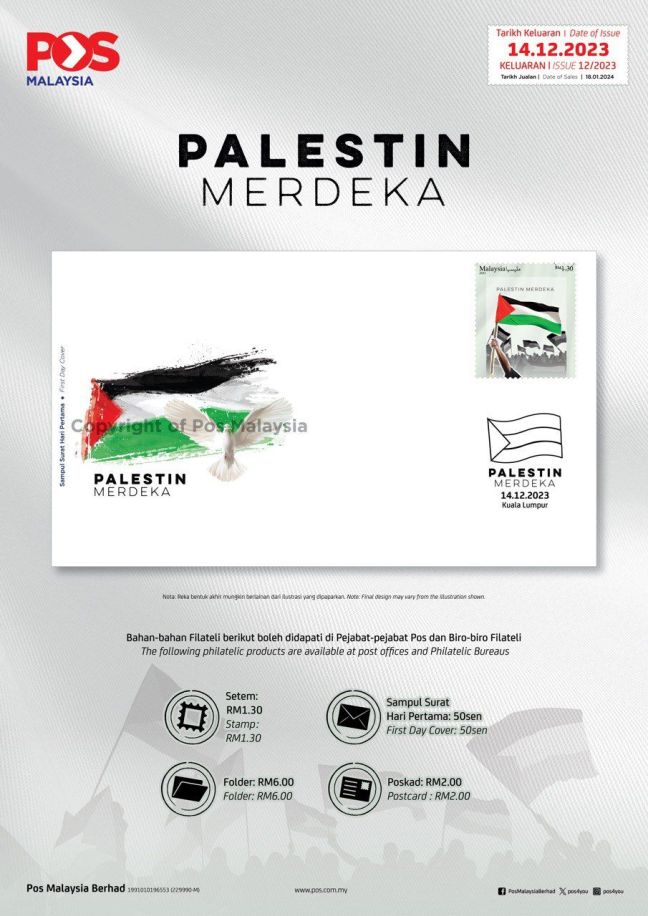 Well here is a nice surprise! A Free Palestine Postcard will also be released on 18 January 2024. The date of issue will remain as 14 December 2023 – the date the stamp was launched.