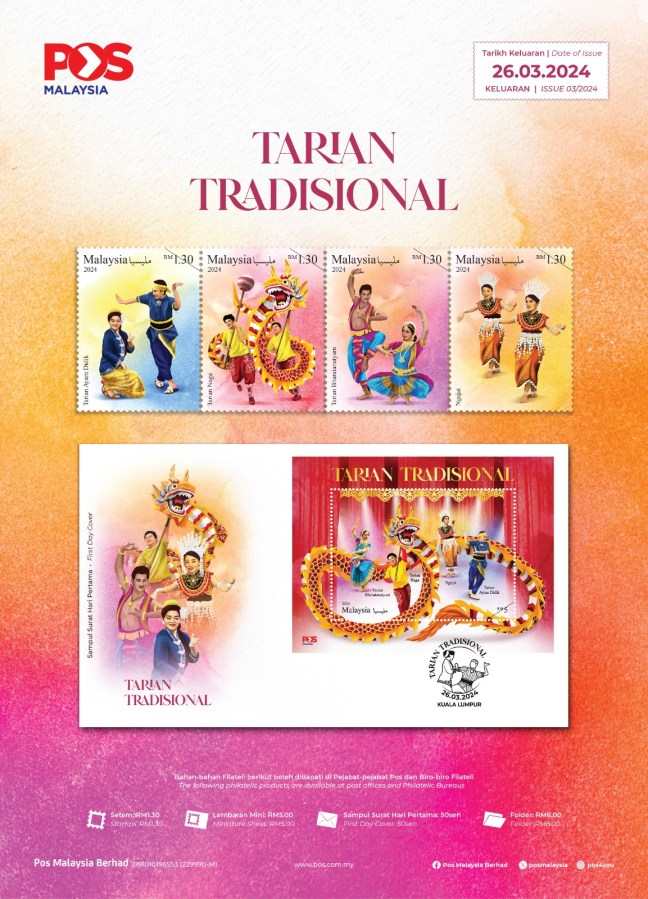 - Setenant Strip of RM 1.30 x 4: Ayam Didik Dance (Tarian Ayam Didik), Dragon Dance (Tarian Naga), Bharatanatyam Dance (Tarian Bharatanayam) and Ngajat
