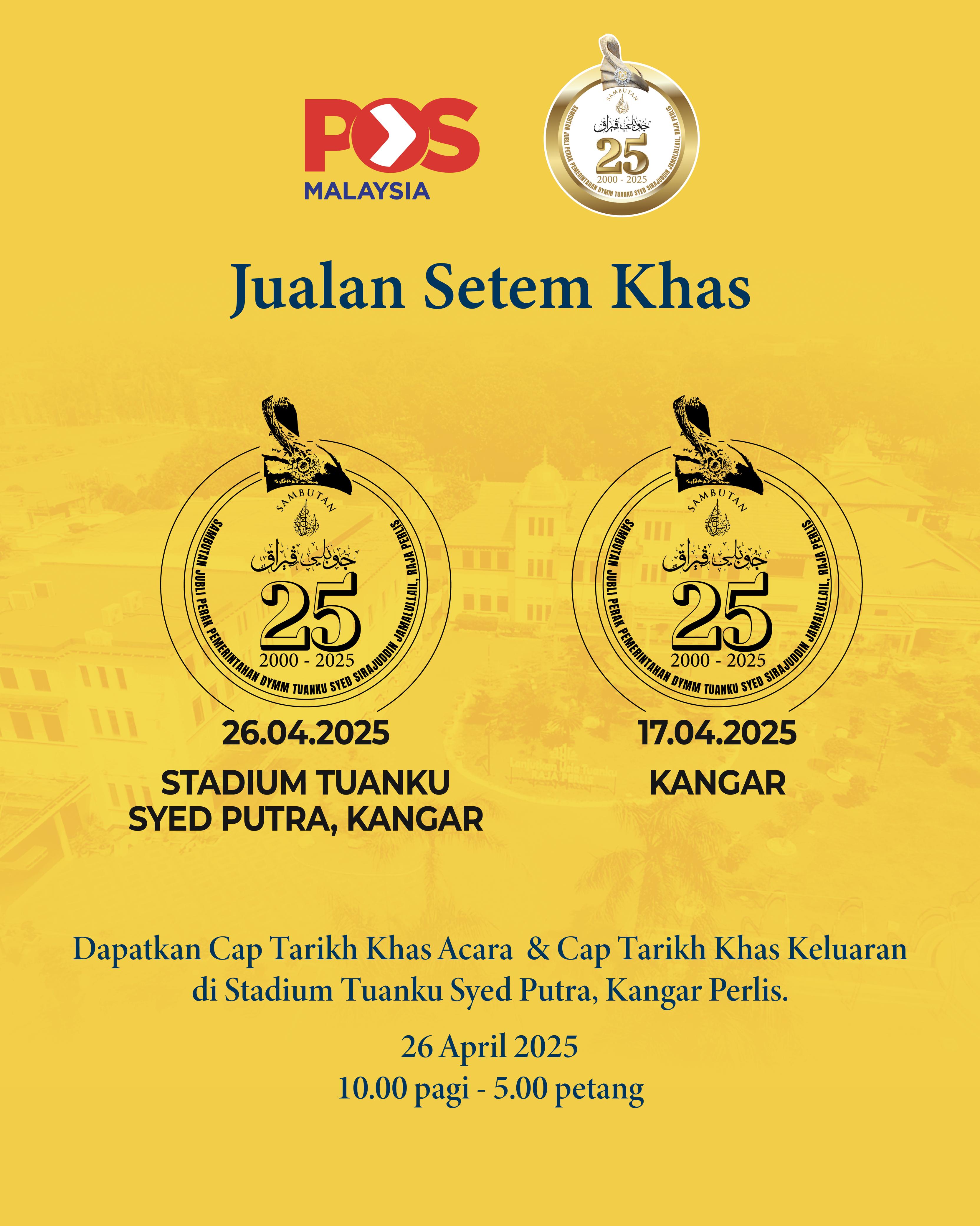 There will also be a special event cancellation dated 26 April 2025 plus the date of issue Kangar cancellation dated 17 April 2025 at the event. So come to the Stadium!