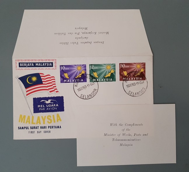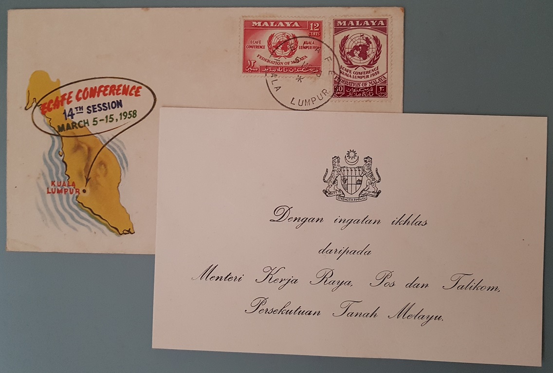 Were there CFDCs pre-Malaysia? Yes most certainly. Here is one issued in 1958 for the ECAFE Conference with the additional insert “Dengan ingatan tulus ikhlas daripada Menteri Kerja Raya, Pos dan Talikom Persekutuan Tanah Melayu” or “With the compliments of the Minister of Works, Posts and Telecommunications Federation of Malaya”. There is no text on the envelope flap.