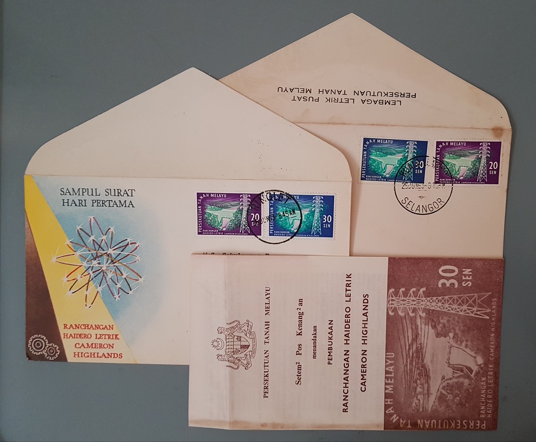 Here is a curious example of a CFDC issued for the Central Electricity Board! The flap has the text “Lembaga Letrik Pusat Persekutuan Tanah Melayu” or “Central Electricity Board Federation of Malaya”. Notice the difference between the regular envelope and the Central Electricity Board envelope in the picture below.