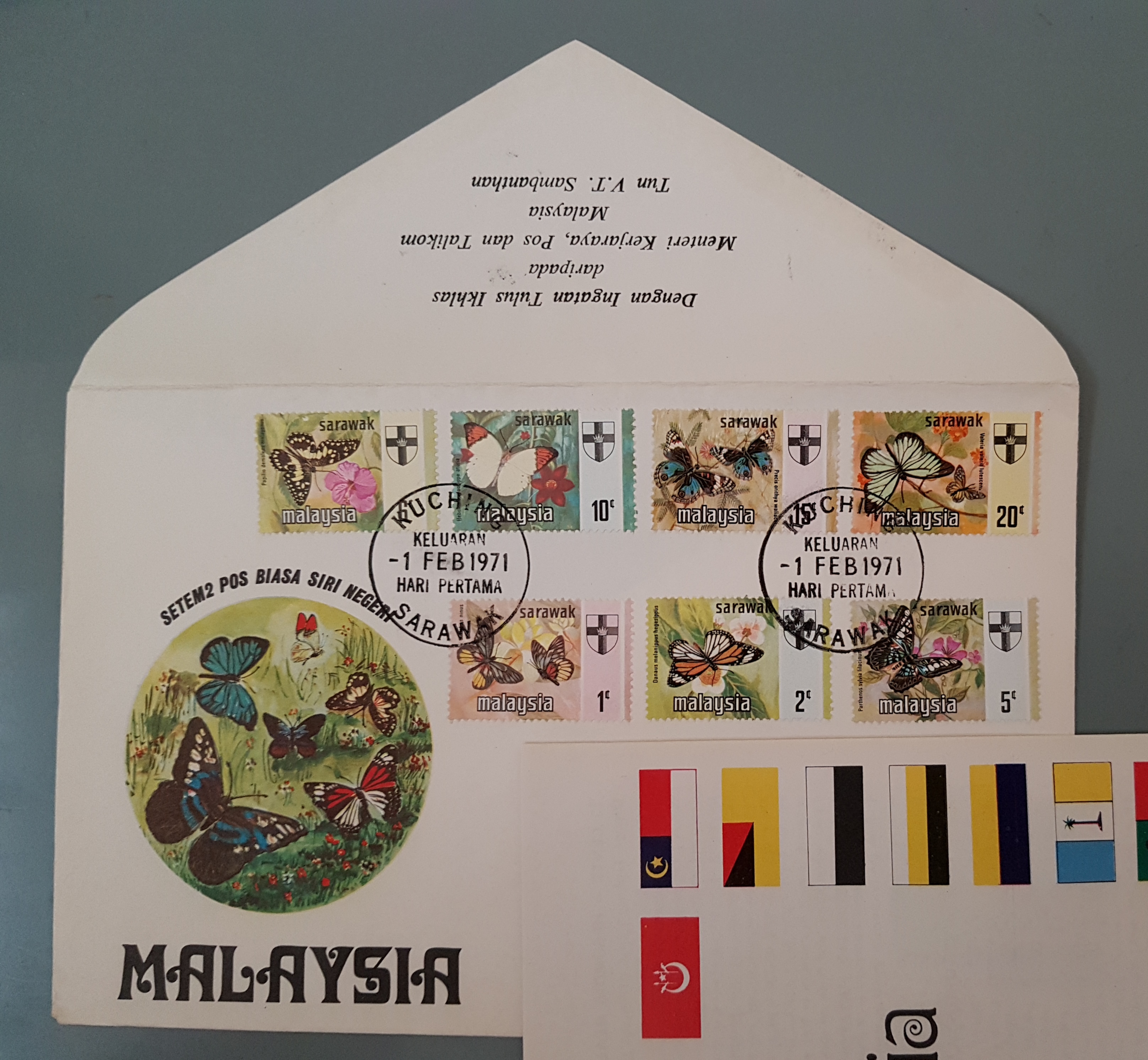 Here is the 1971 Butterflies Definitive CFDC. It was sent as a full Philatelic set to a foreign postal administration head. Note that the Minister’s name “Tun V.T. Sambanthan” is included.