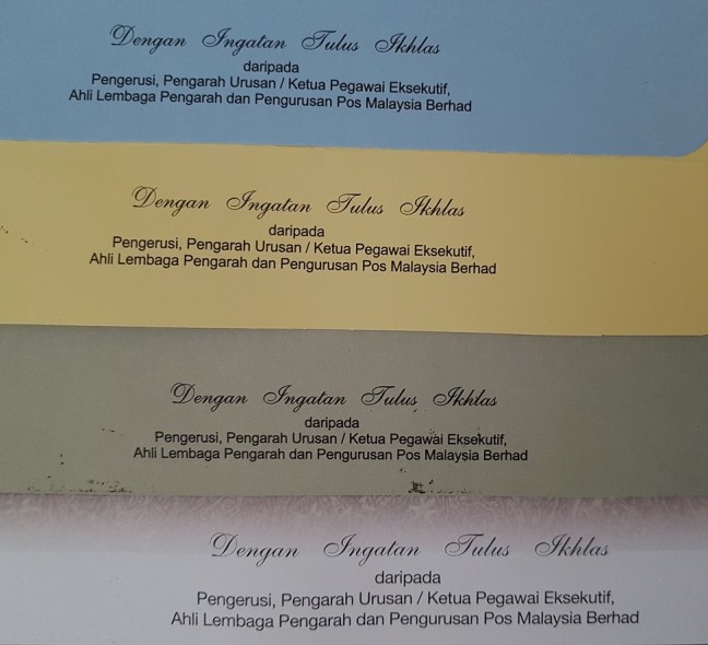 Here are some recent CFDCs with the text “Dengan Ingatan Tulus Ikhlas daripada Pengerusi, Pengarah Urusan / Ketua Pengawai Eksekutif, Ahli Lembaga Pengarah dan Pengurusan Pos Malaysia Berhad” or “With the Compliments of the Chairman, Managing Director / Chief Executive Officer, Board of Directors and Management of Pos Malaysia Berhad”.