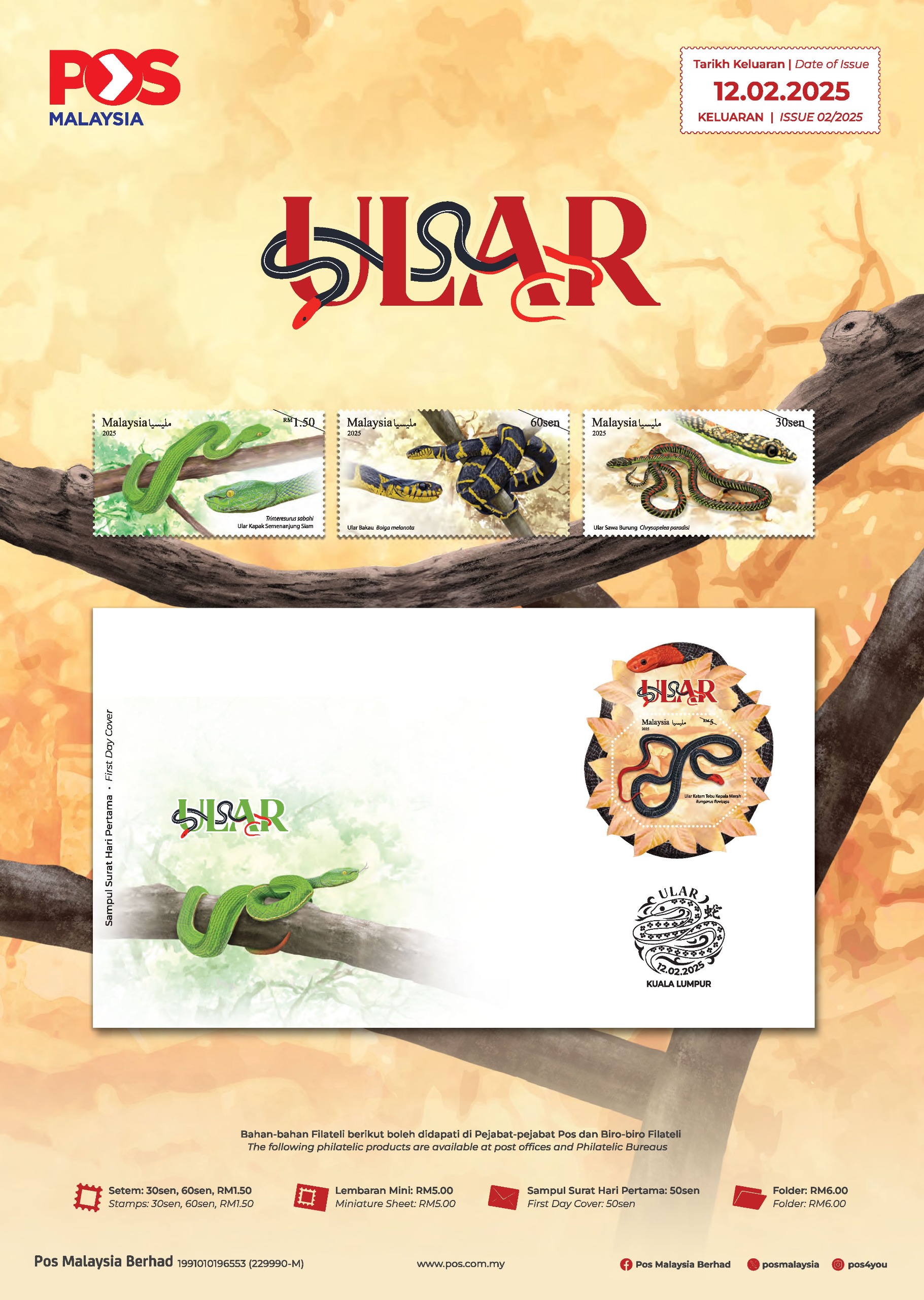 The Year of the Snake stamps and Miniature Sheet will again be issue after the Lunar New Year on 12 February 2025.