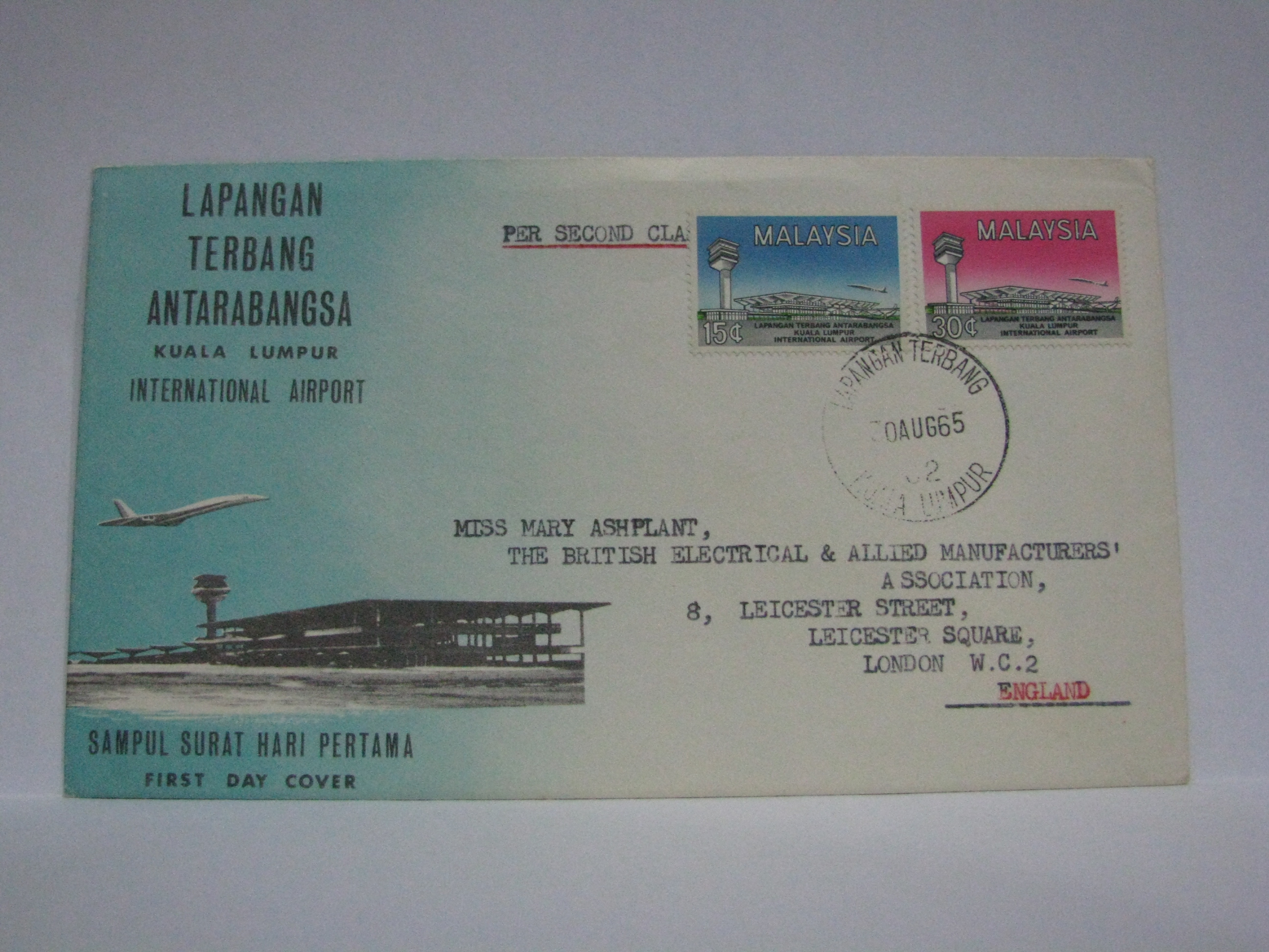 This FDC was sent via normal mail and cancelled with the Lapangan Terbang C2 cancellation.