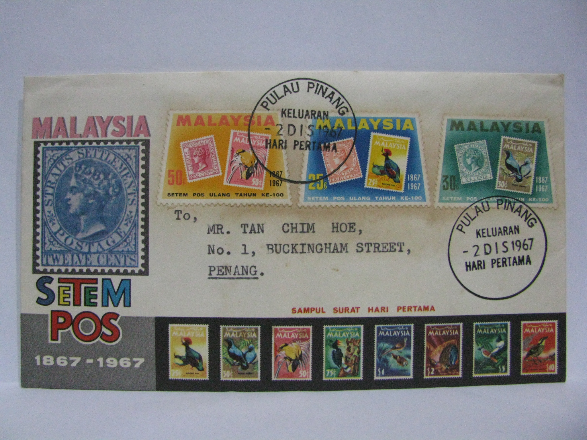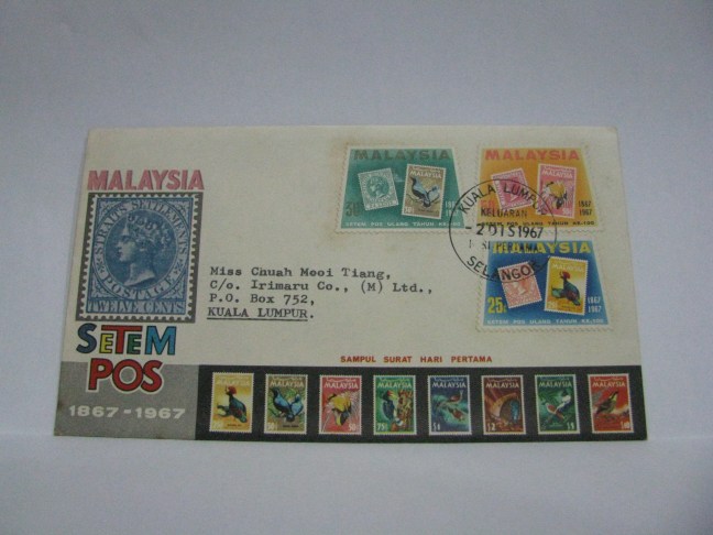 As an item of interest, the Singapore Stamp Club held a Centennial Stamp Exhibition 21 – 23 September 1967 at the National Library. The common theme with Malaysia was that the first stamps were issued in Straits Settlements. Singapore was part of Straits Settlements. This exhibition cover was cancelled in Singapore with the exhibition slogan cancel on the first day of exhibition (21 September 1967).