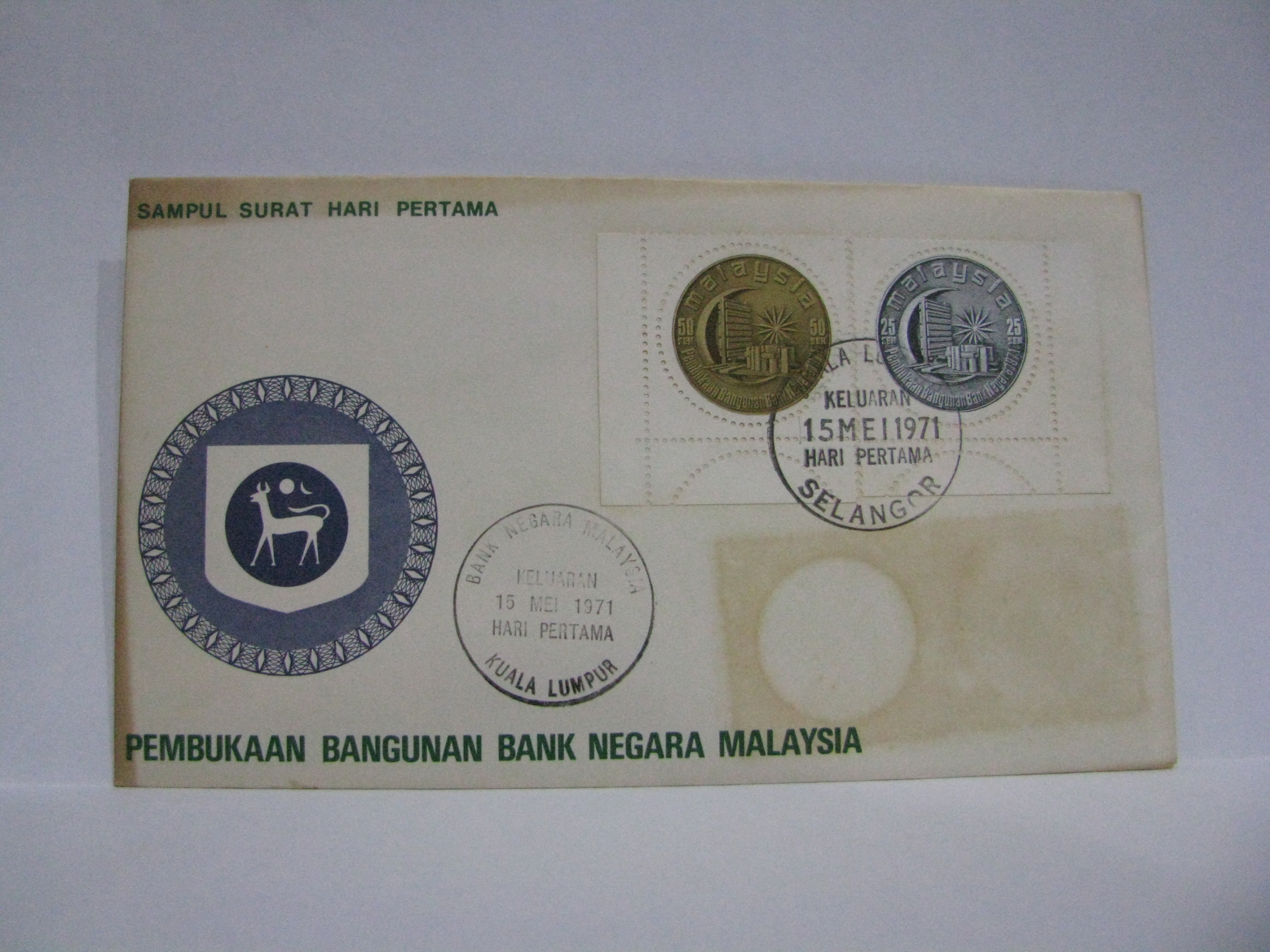 A special cancellation was issued for the opening. This FDC has two cancellations – the Kuala Lumpur cancellation as well as the special Bank Negara Malaysia cancellation.