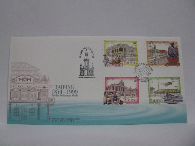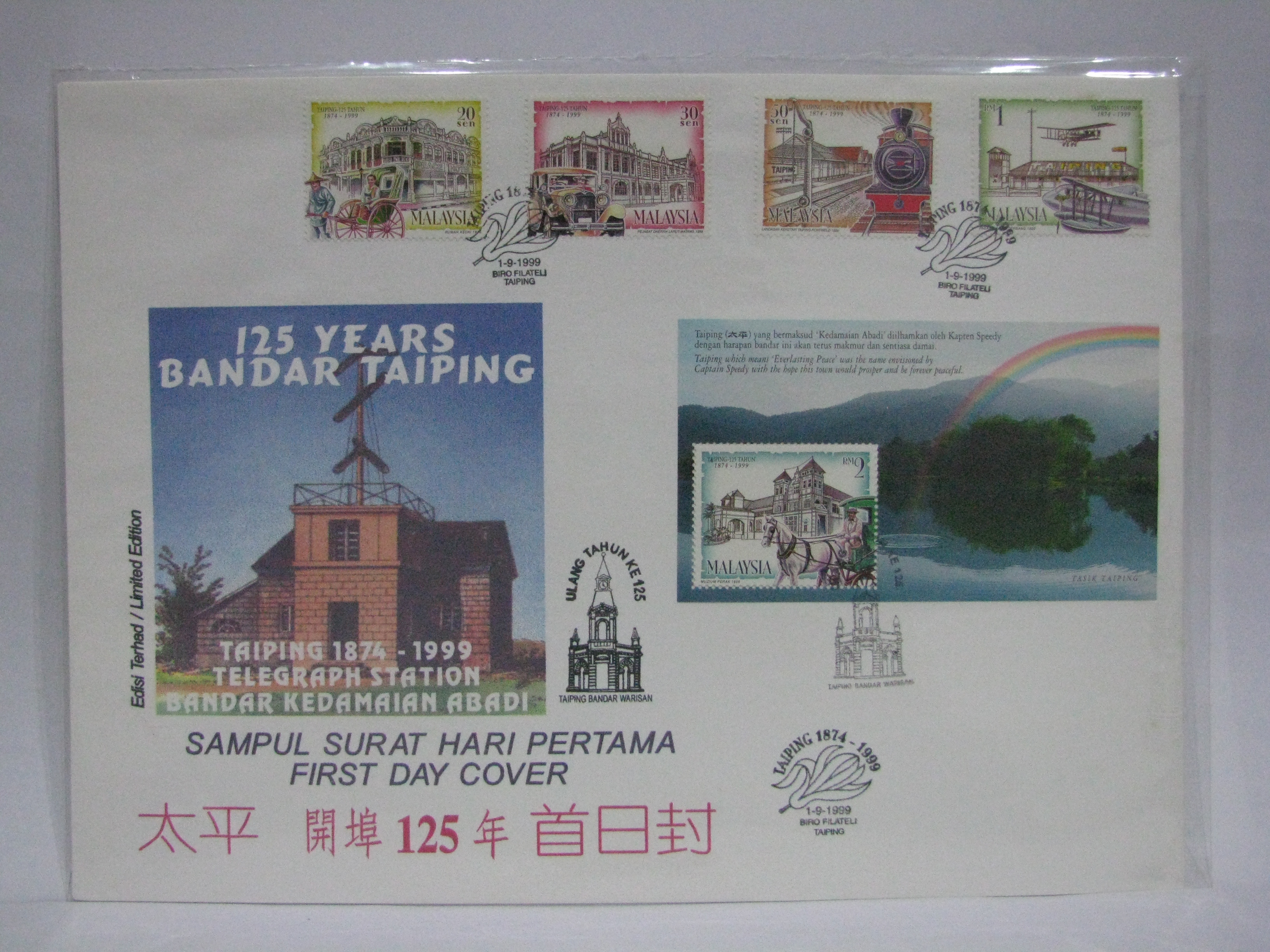 The FDCs were cancelled in Taiping and includes a very rare cachet Ulang Tahun 125 Taiping Bandar Warisan. Fake cancellations exist using inkjet for this issue.