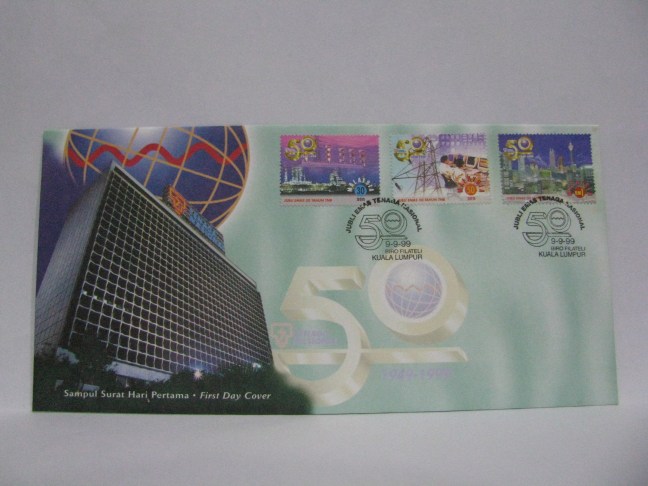 A composite FDC was issued in a folder by Pos Malaysia. The cover was cancelled in Kuala Lumpur and includes a Jubli Emas Tenaga Nasional 09 – 12 Sept ’99 cachet.