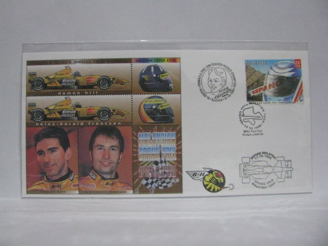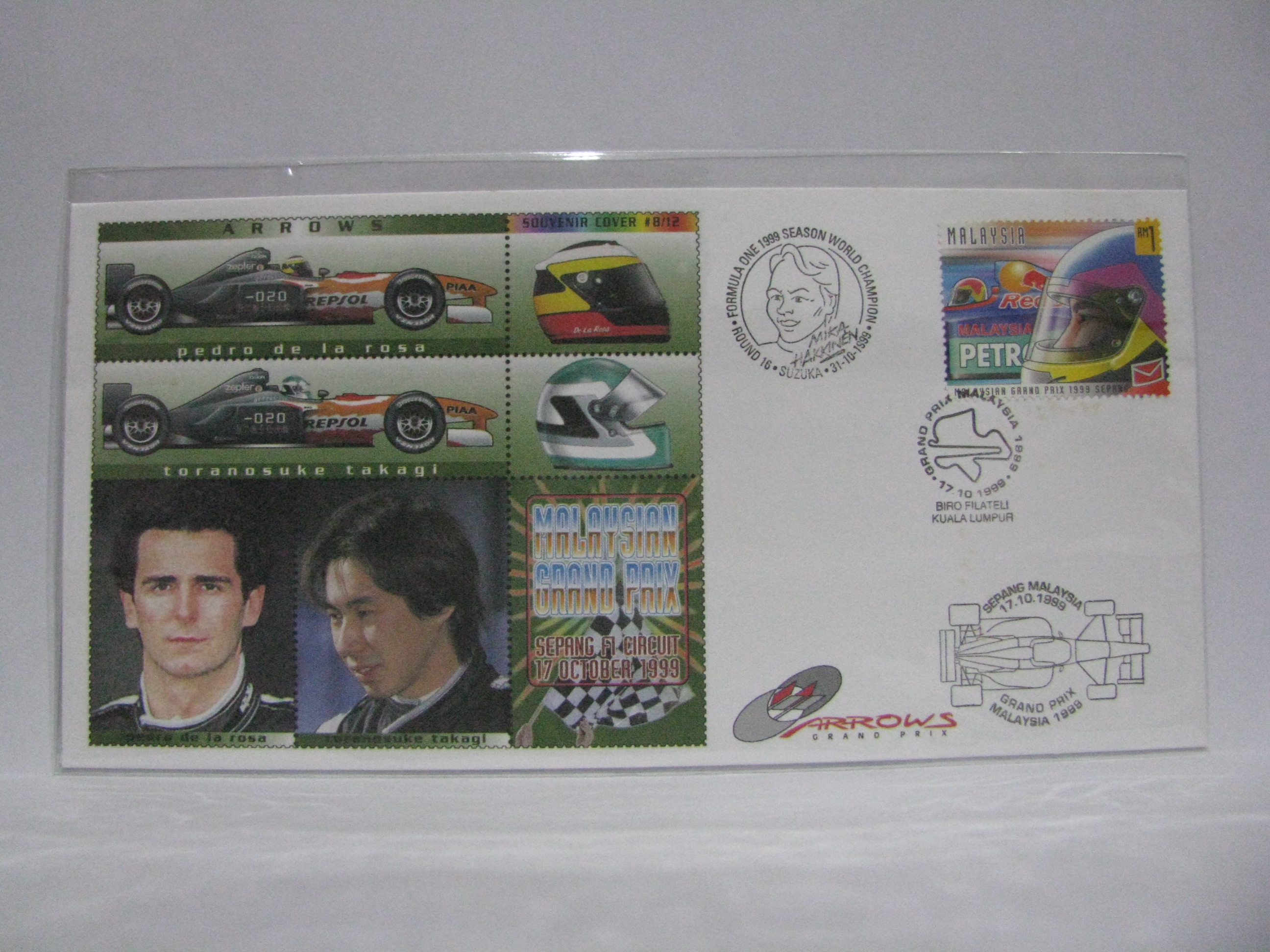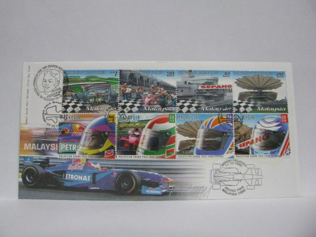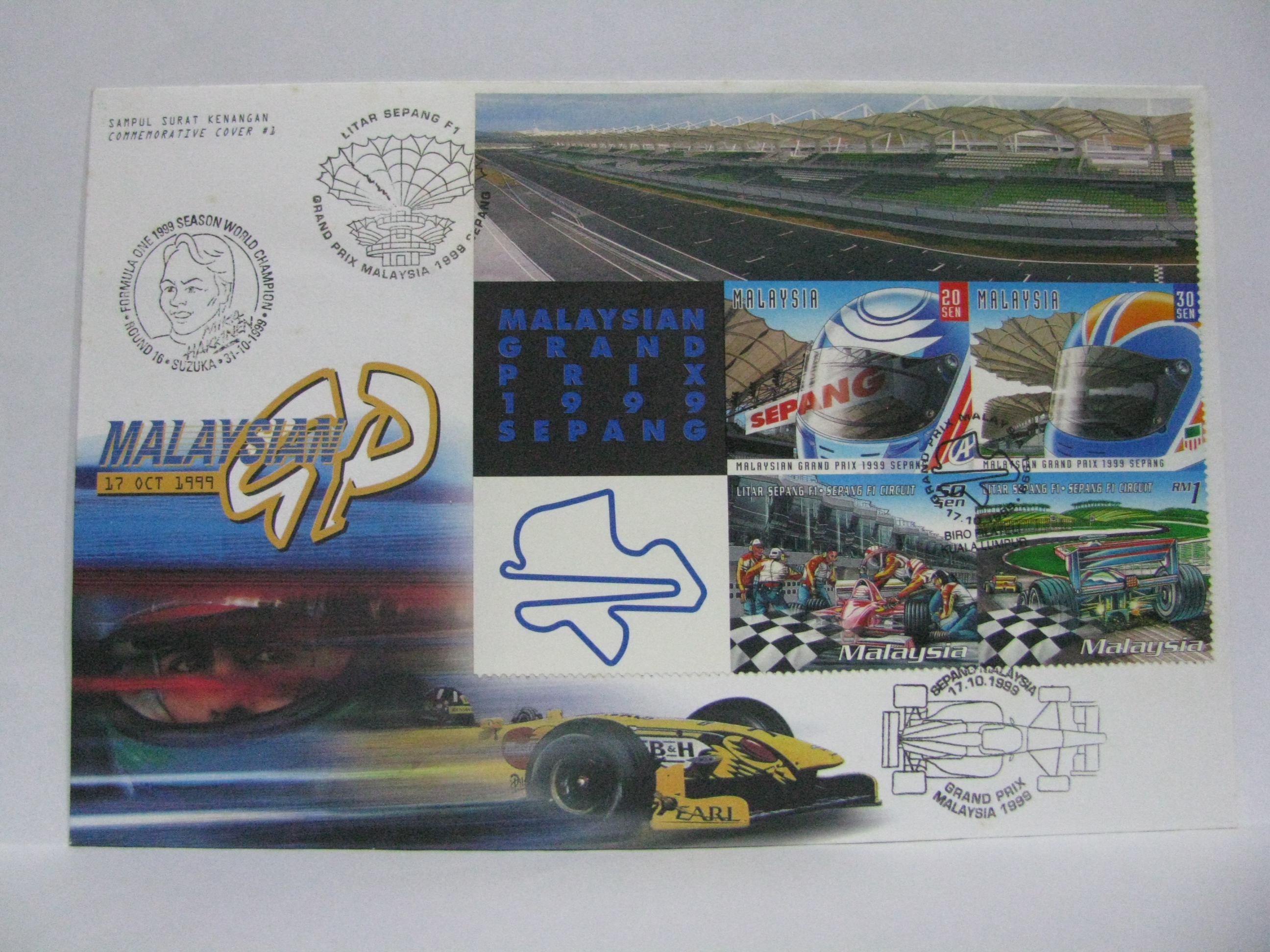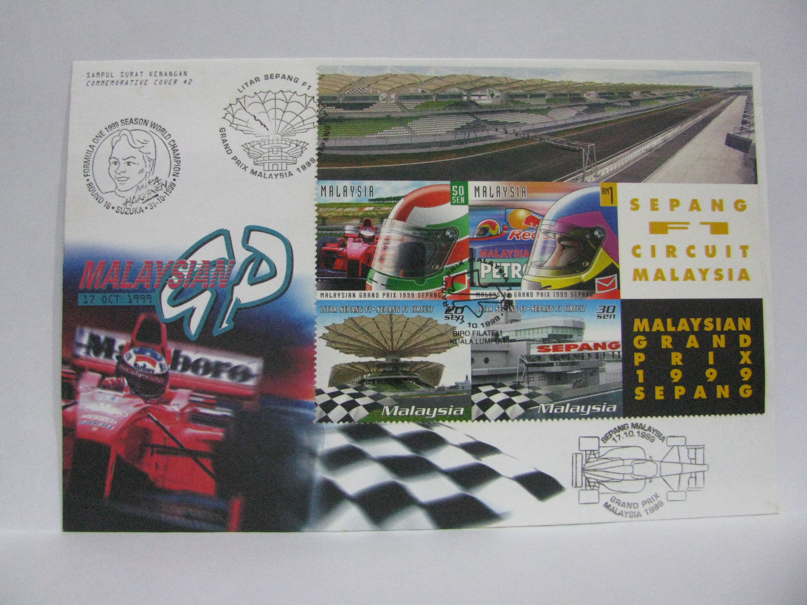 The FDC was cancelled in Kuala Lumpur along with a Sepang Grand Prix Malaysia 1999 cachet and signed by the designer, PK Chuah. There is an additional Mika Hakkinen cancellation (31 October 1999) issued to commemorate his win in Suzuka soon after the Malaysian Grand Prix.