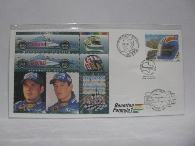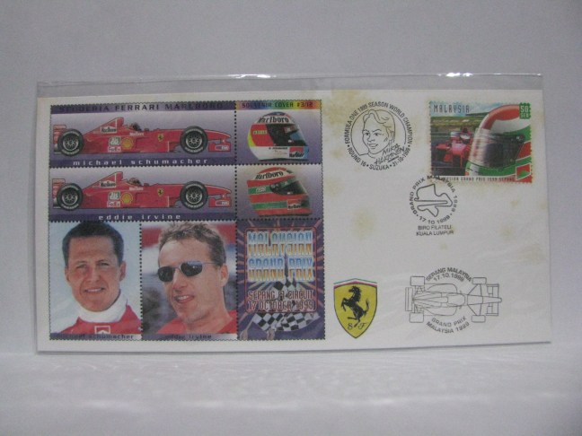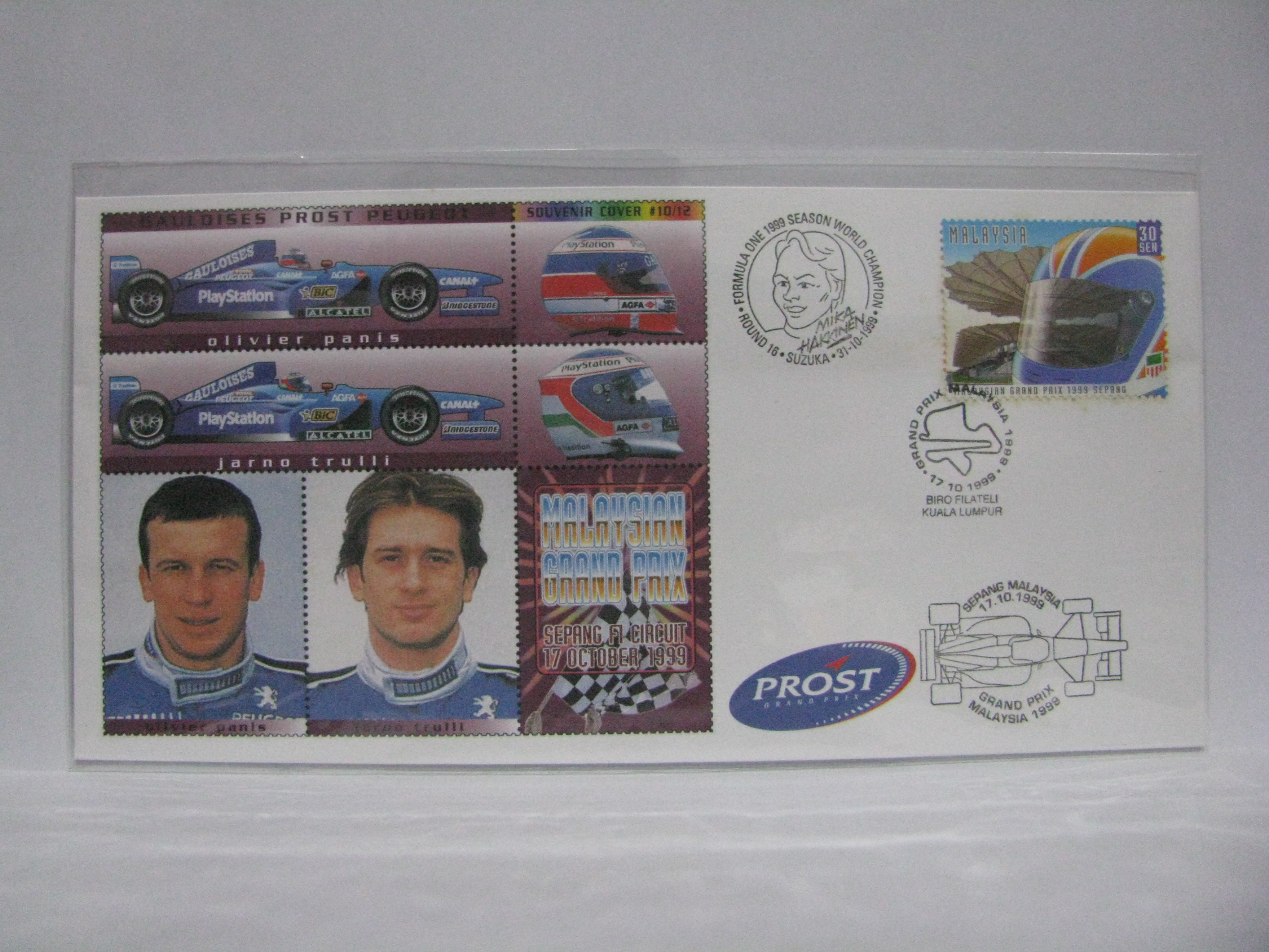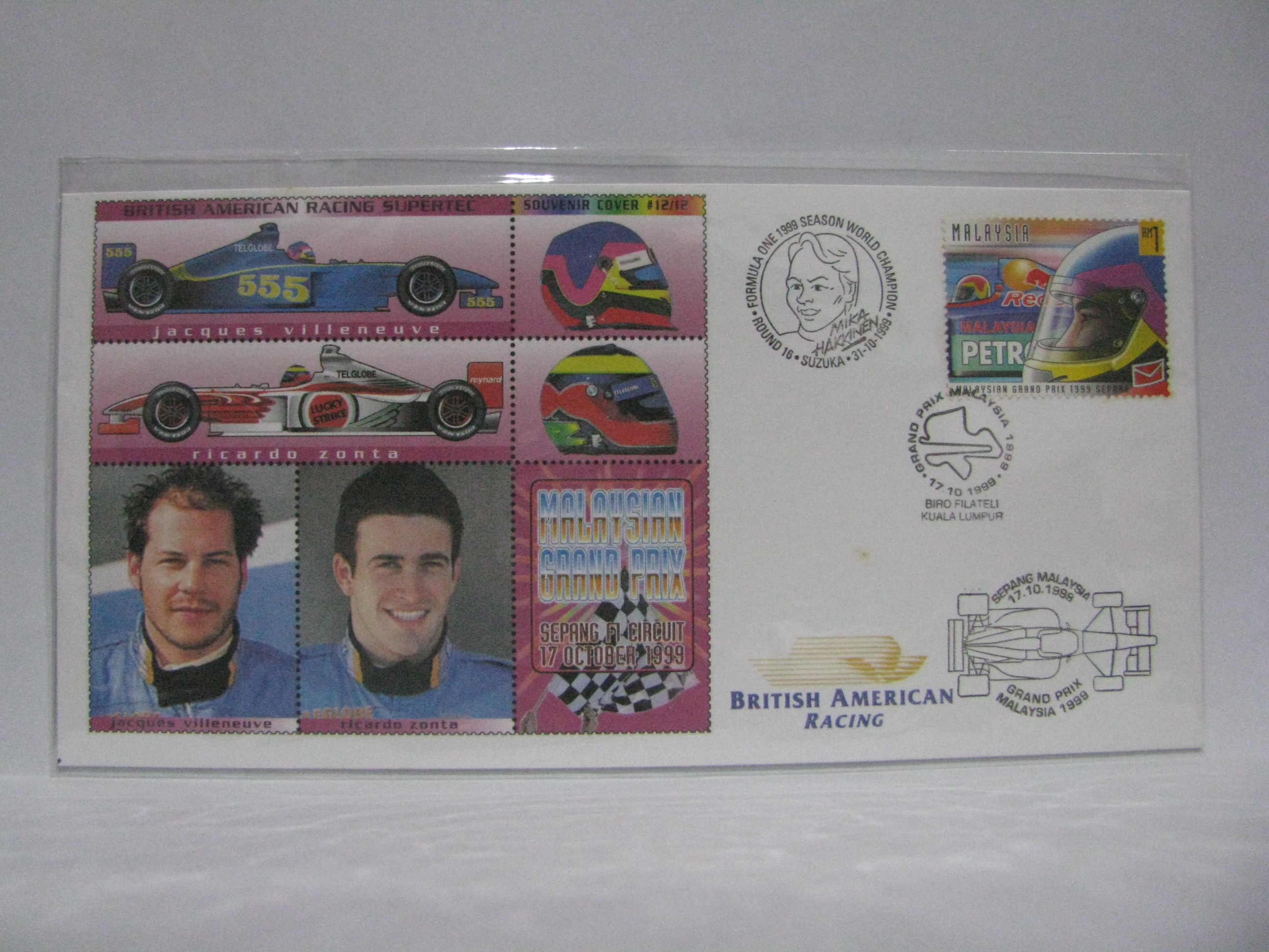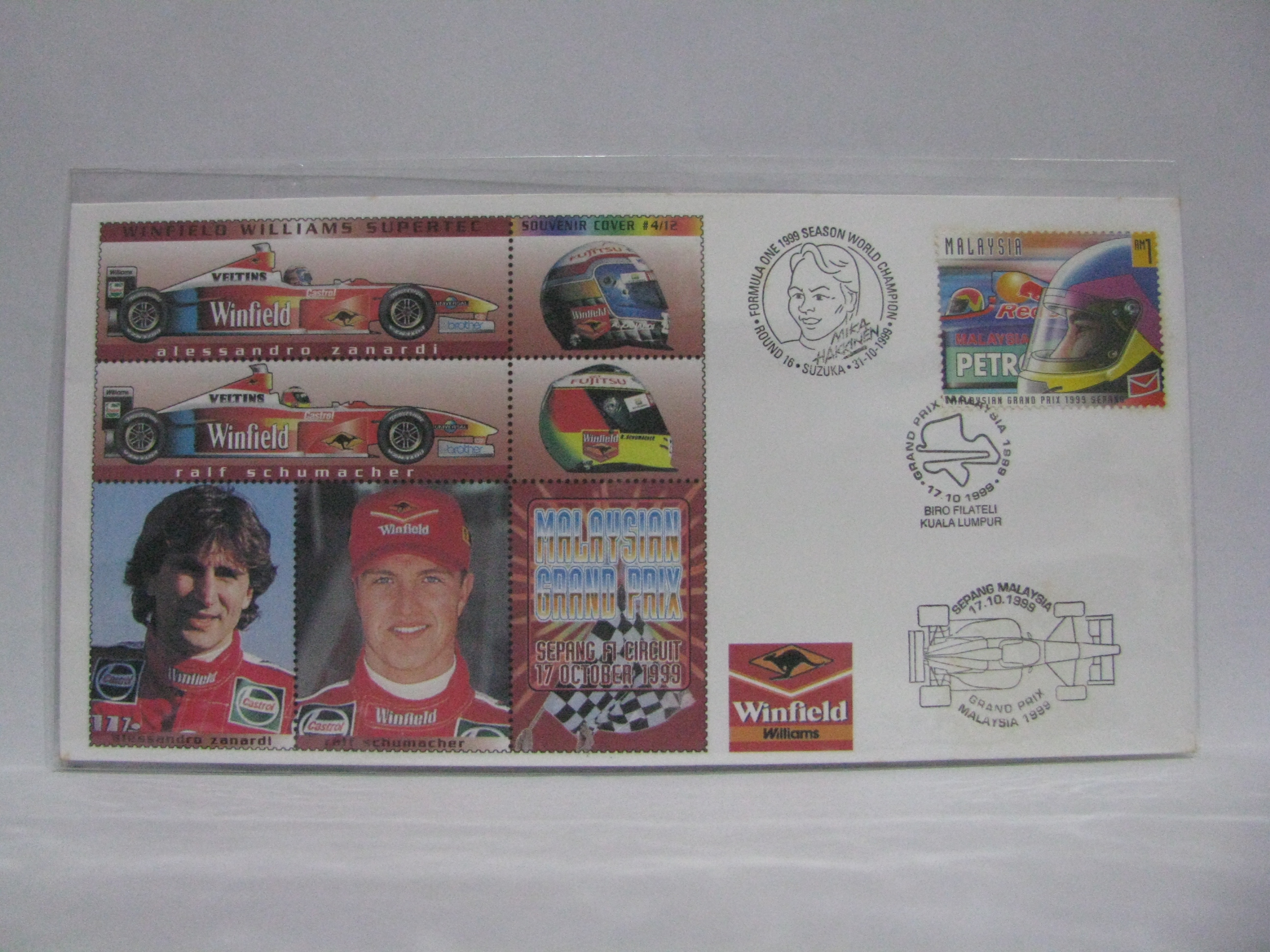 The FDC was cancelled in Kuala Lumpur along with a Sepang Grand Prix Malaysia 1999 cachet and signed by the designer, PK Chuah. There is an additional Mika Hakkinen cancellation (31 October 1999) issued to commemorate his win in Suzuka soon after the Malaysian Grand Prix.