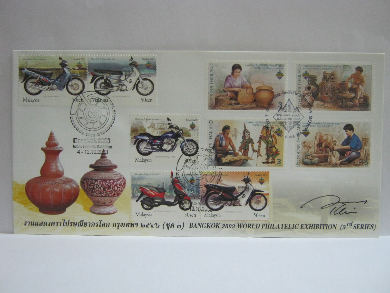 This is the Thailand Post FDC affixed with Malaysia exhibition overprint stamps and cancelled with the exhibition cachet. It is also autographed by the Malaysia stamps designer, Mr KY Lim.