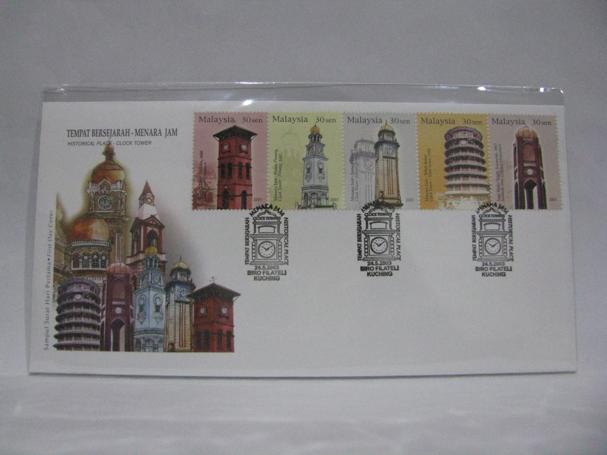 Here is a FDC cancelled in Melaka, Pulau Pinang, Sungai Petani, Teluk Intan and Bintulu corresponding to the clock towers on the cover. The Bintulu cancellation is a forgery. This was discovered recently (2018) as more samples of Bintulu cancellations were compared between concordant collectors.