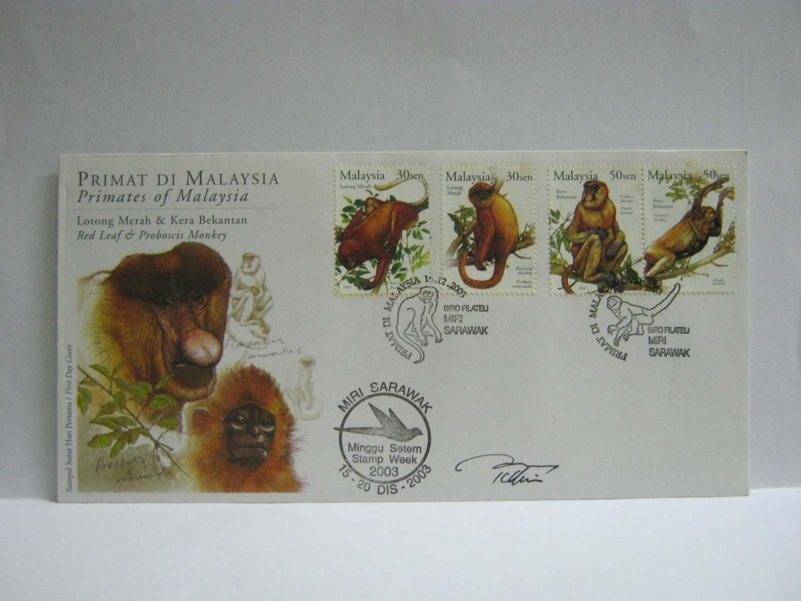 16 December 2003: Stamp Week ’03 Primates of Malaysia Red Leaf & Proboscis Monkey