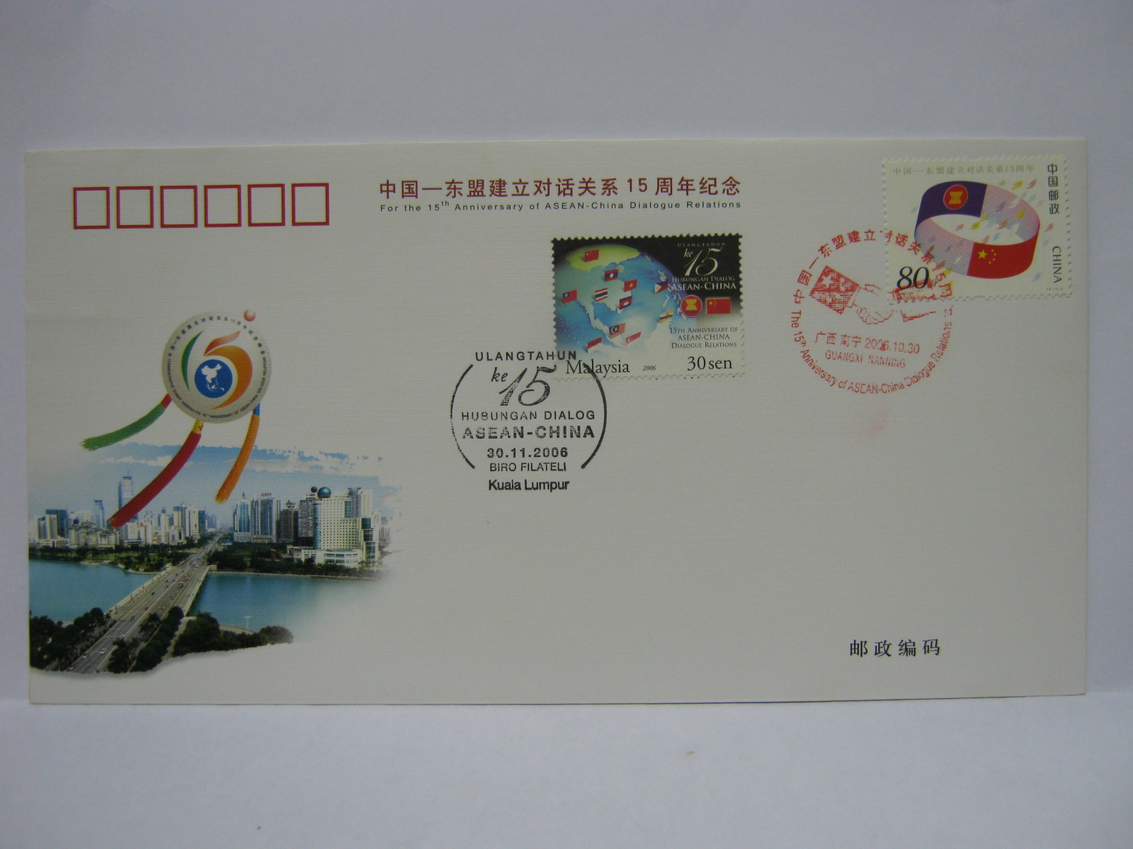 This FDC was cancelled in Kuala Lumpur. Malaysia was the first country where the AESAN – China relations meeting was first held. As such, Kuala Lumpur was given the honour to represent ASEAN to issue the commemorative stamp with China. This is not a joint issue as the design and the date of issue are different.
